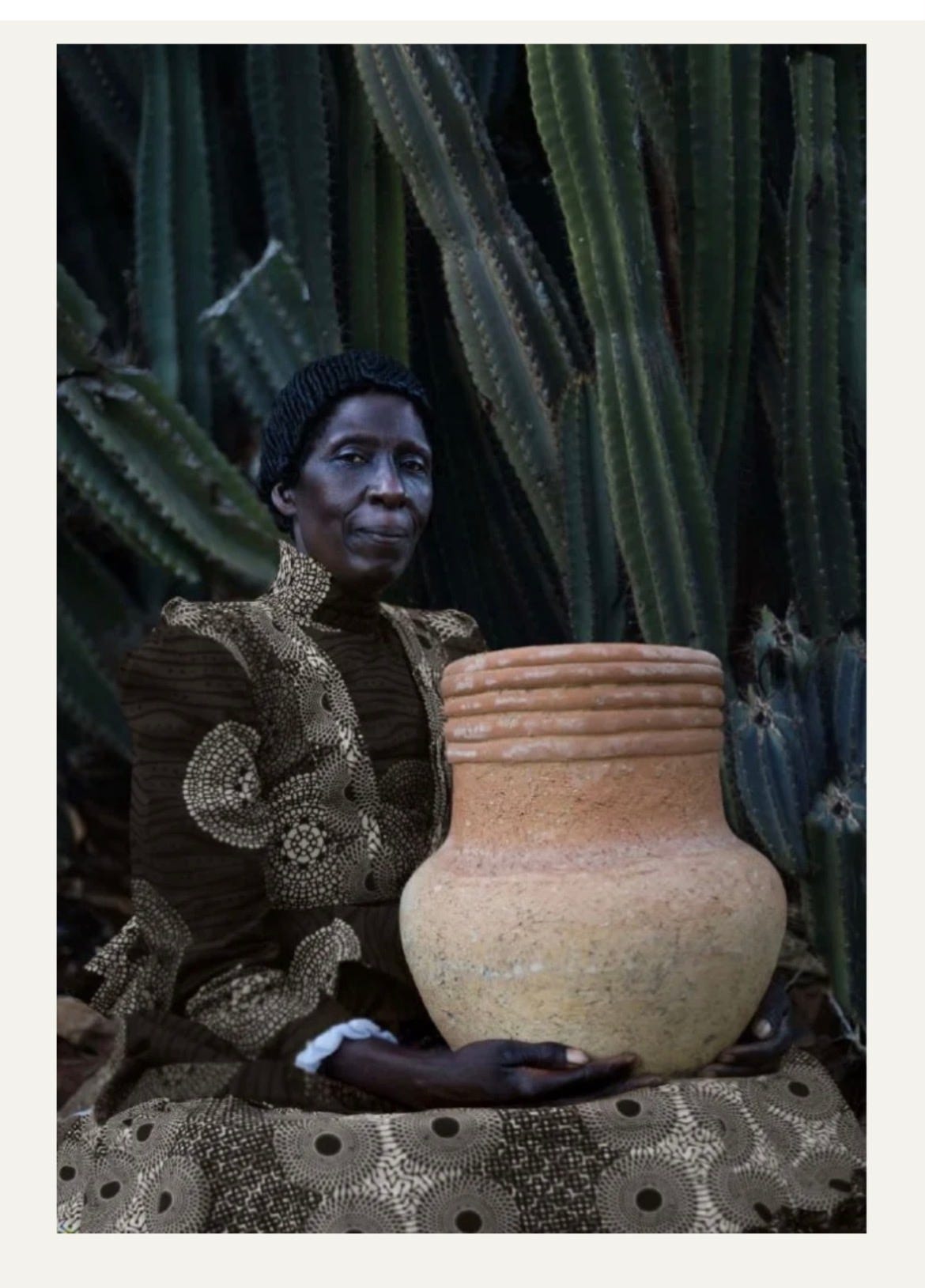 I walked into the hotel’s lobby and saw a dark-skinned woman wearing a magnificent gown and holding an enormous clay pot. She startled me. Her gaze was familiar–penetrating, disarming. I stood in front of her as if she wasn’t in a photograph, as if she was an elder who came to save me.